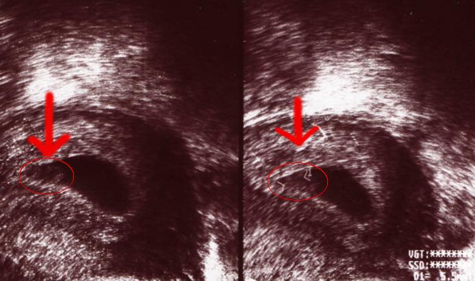 Hier ist die Fruchtblase (der schwarze Fleck) zweimal fotografiert.